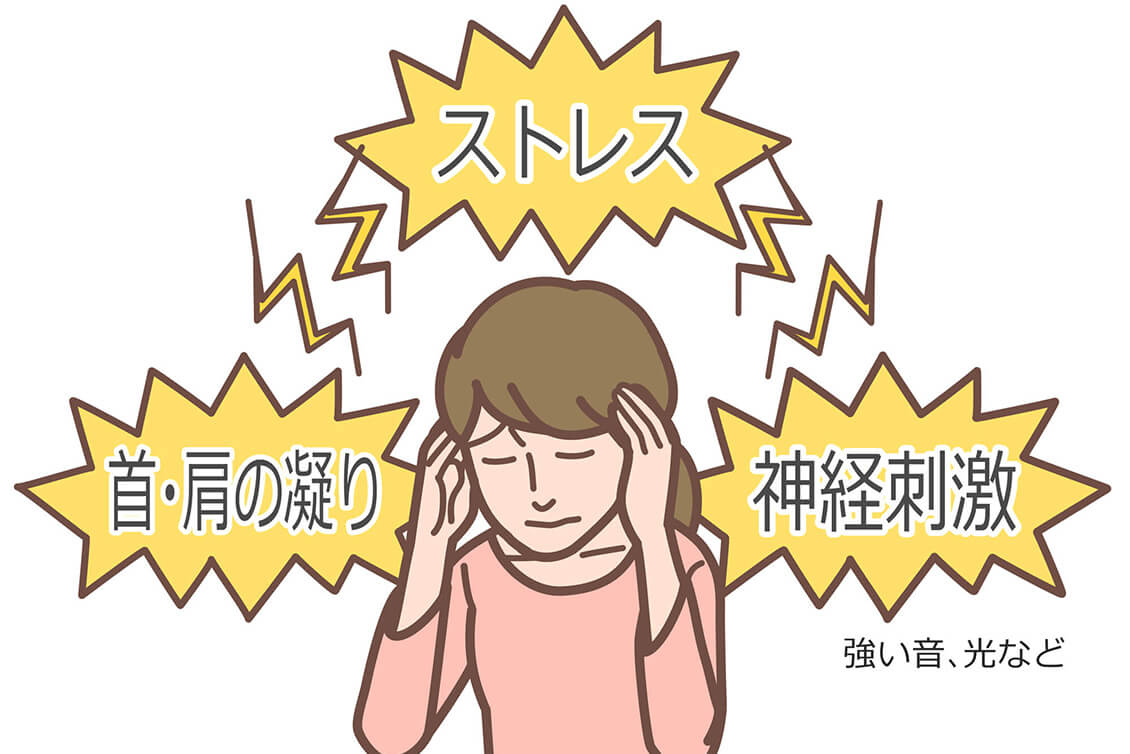 一方、片頭痛は、脳の血管が急激に拡張することが原因と考えられています。疲労やストレスからの解放、特定の飲食物、不規則な睡眠、女性ホルモンの変動、アルコールの摂取などが引き金となって血管が急に広がり、ズキズキとした痛みを発症させます。また、天候や気圧の変化、光や音などの刺激も誘因となることがあります。