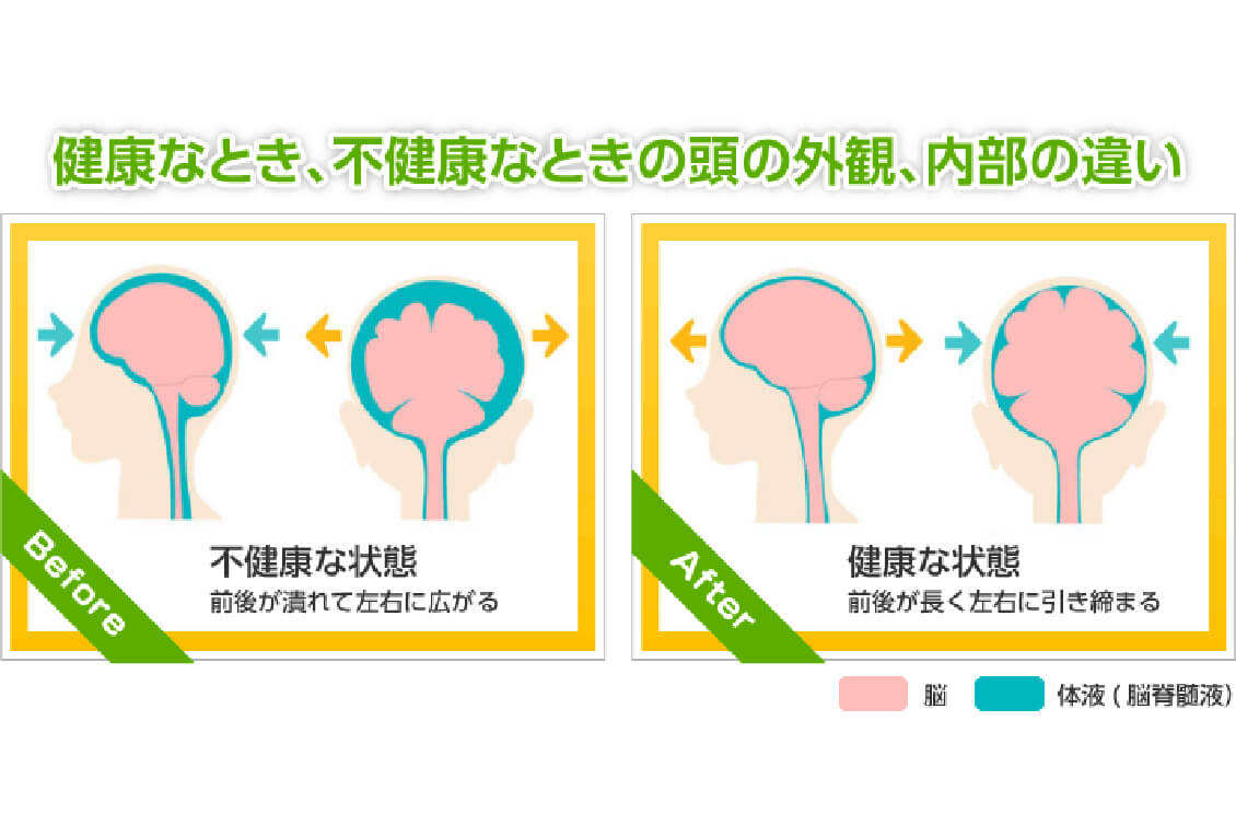 頭痛に悩む方の多くは、脳脊髄液の流れが悪くなり、頭蓋骨と脳の間に液が溜まることで、頭部の圧力(内圧)が上がっている状態にあります。これが、あの辛い痛みの直接的な原因です。